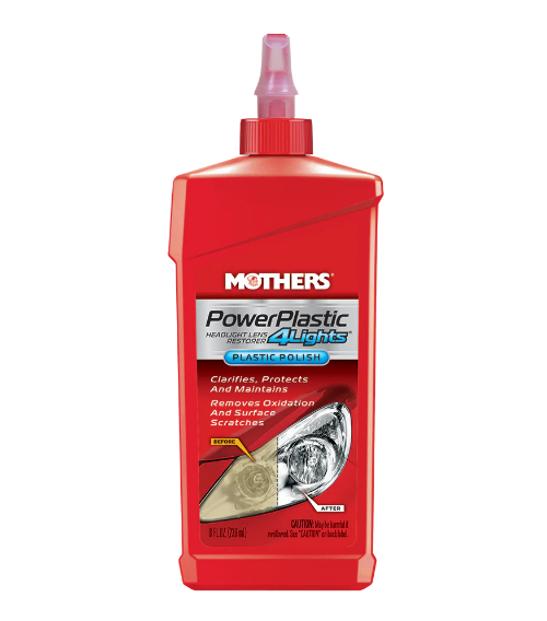 Mothers PowerPlastic 4Lights quickly and easily polishes and protects a wide variety of hard or flexible clear plastics. Oxidation-inhibiting polymers, UV shields and an ultra-fine polish clean and clarify, preventing premature yellowing and aging.